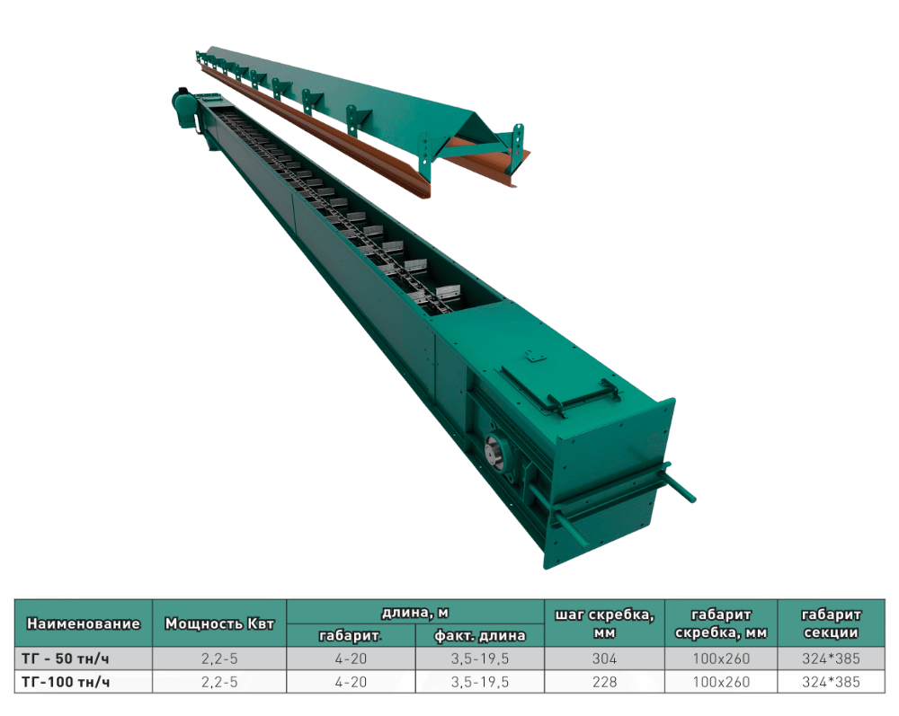 Данное оборудование предназначено для горизонтального или наклонного (до 45°) перемещения зерна, кусковых и сыпучих грузов. Транспортировка осуществляется с помощью скребков, закрепленных на тяговой цепи и движущихся внутри закрытого желоба или трубы.